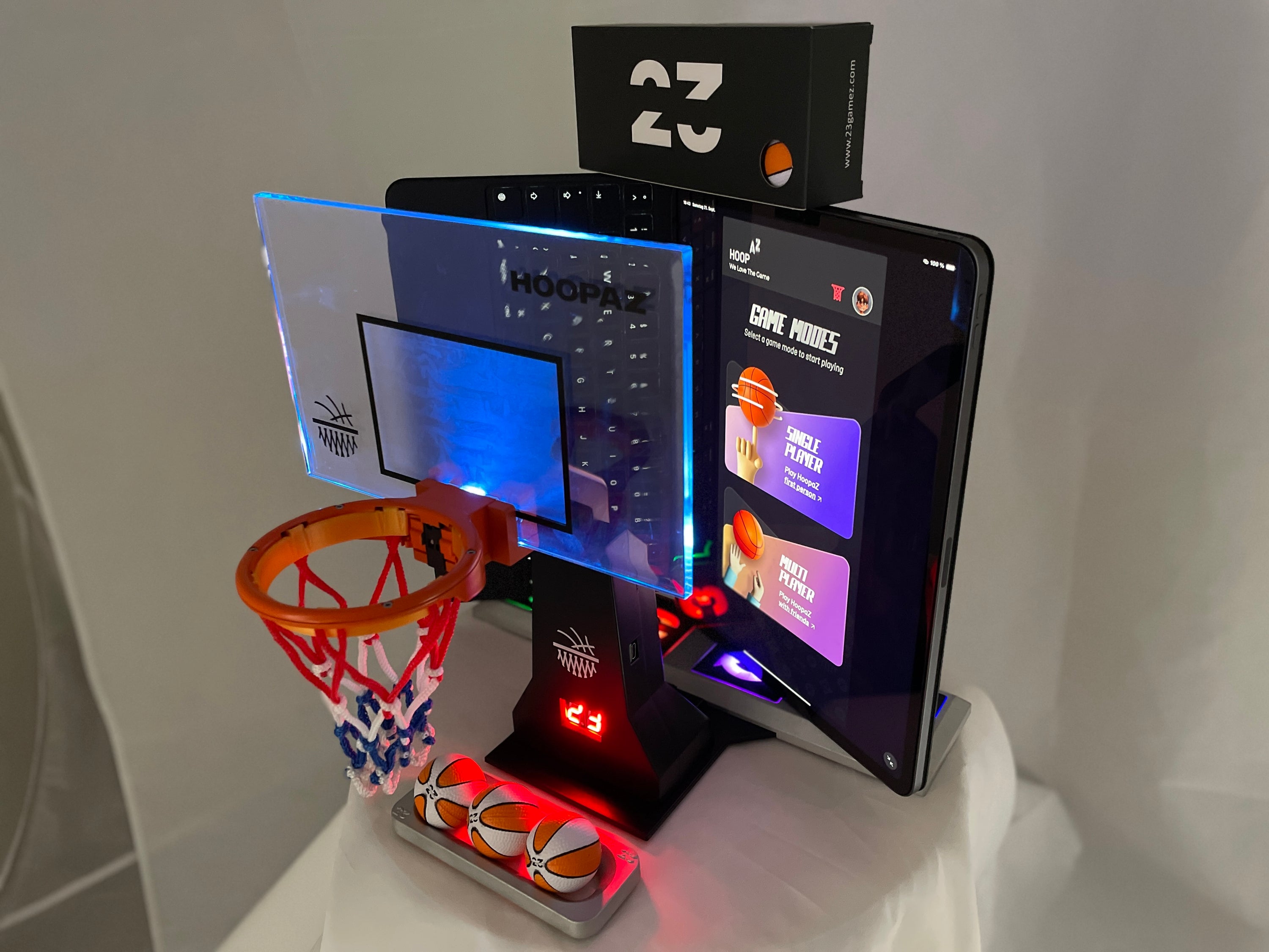 Mit der App kannst du dein Hoopaz komplett von deinem Device aus digital steuern. Alternativ hast du die Möglichkeit, die physischen Hightech-Game-Buttons deines Hoopaz zu nutzen.